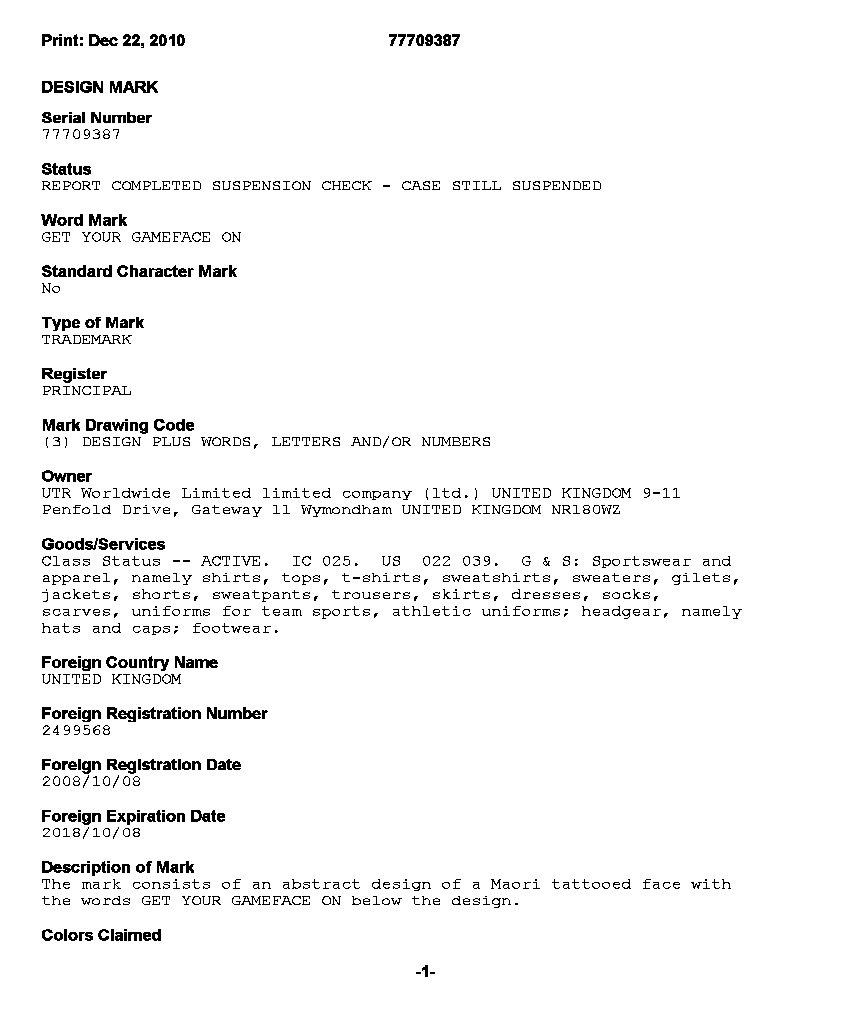 | APPLICATION SERIAL NO. 85154340 MARK: GET YOUR GAME FACE ON | |