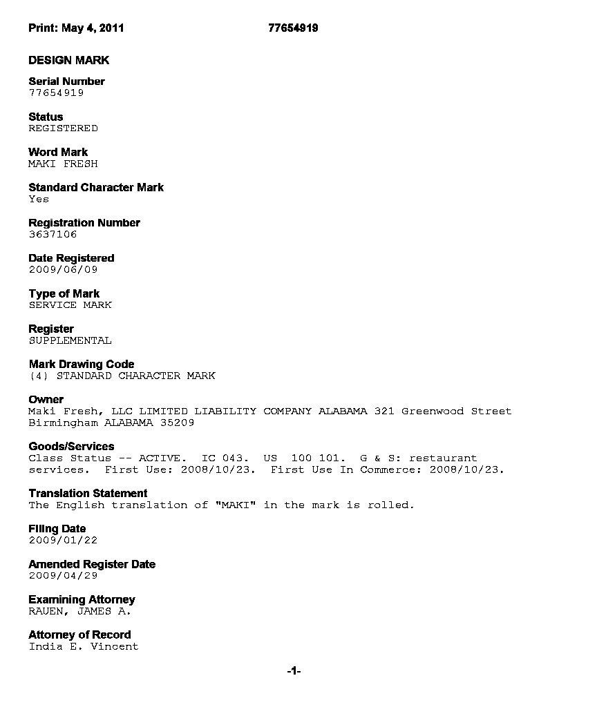 Applicant must disclaim the descriptive wording “MAKI” apart from the mark as shown because it merely describes the nature of the goods offered in the applicant’s restaurants. The applicant has specified the term may be translated as “roll.” See 15 U.S.C. §1056(a); TMEP §§1213, 1213.03(a). The term refers to a type of roll offered in sushi restaurants. See attached definitions. The term merely names the goods, “rolls” featured in the restaurant services. As evidence that this Office has found the term to be descriptive for related goods or services, note the attached U.S. Registrations with the term disclaimed.