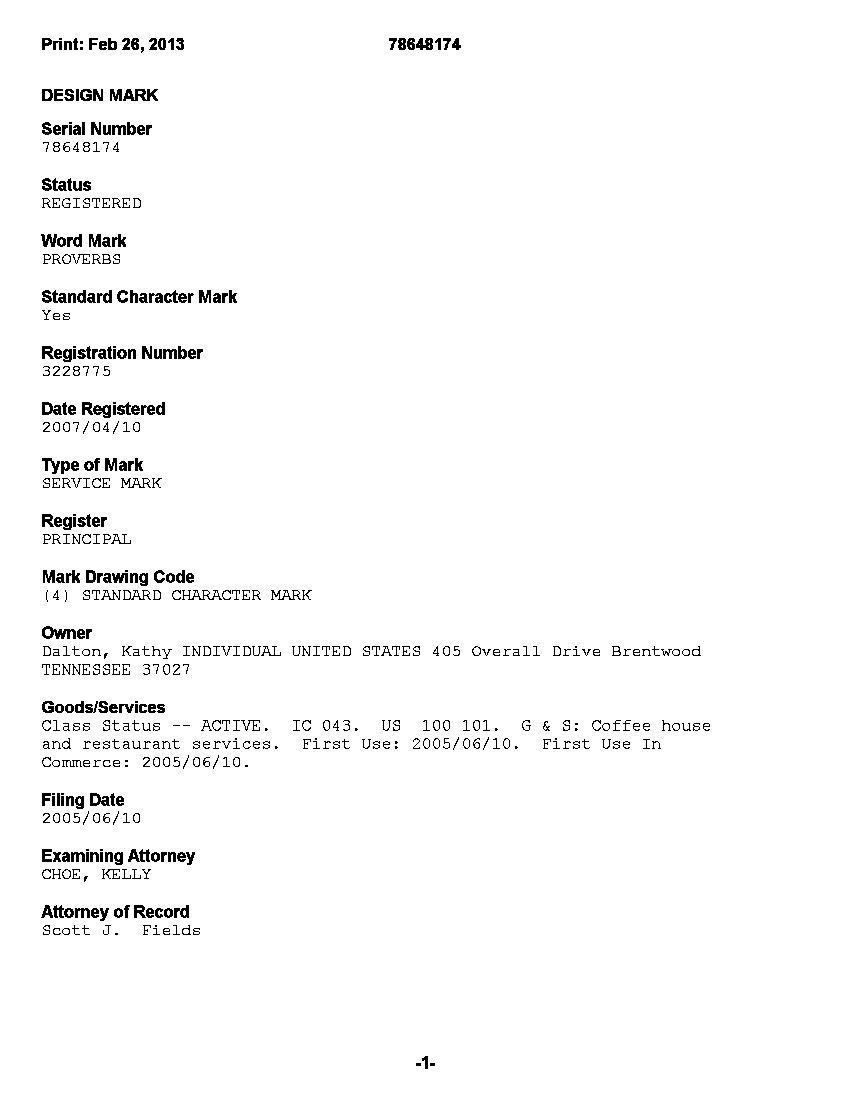 | U.S. APPLICATION SERIAL NO. 85778499 MARK: PROVERB | |