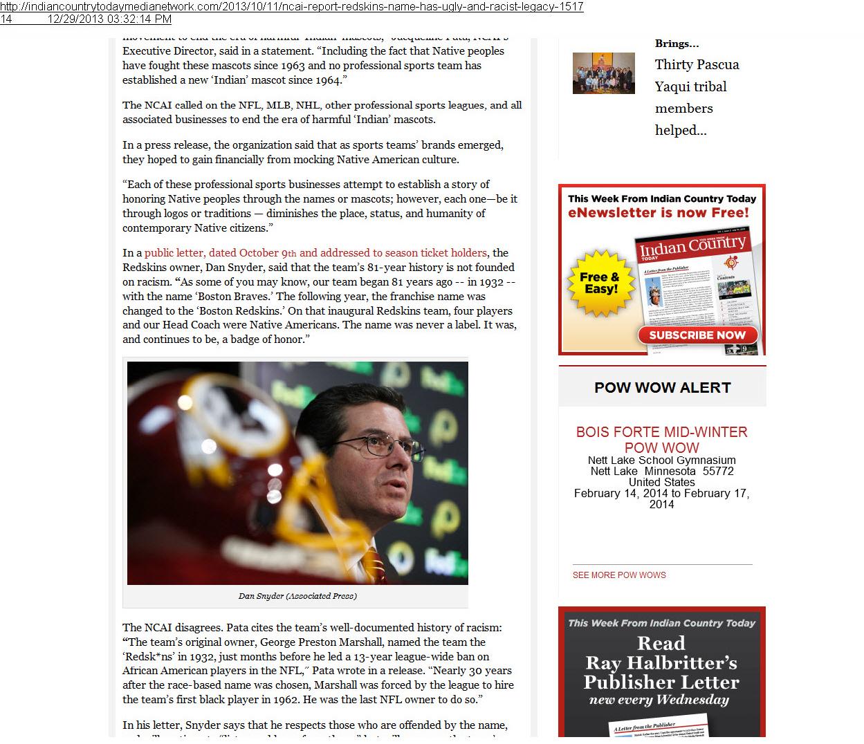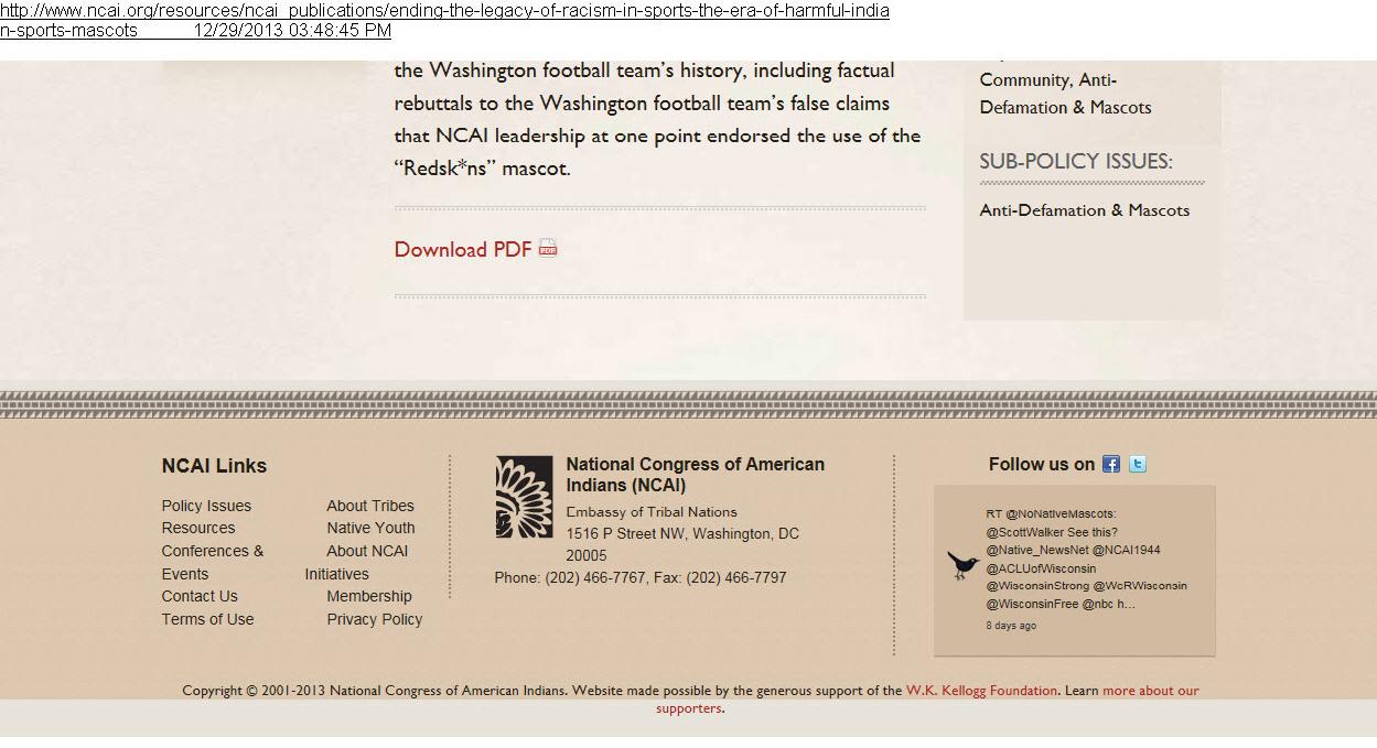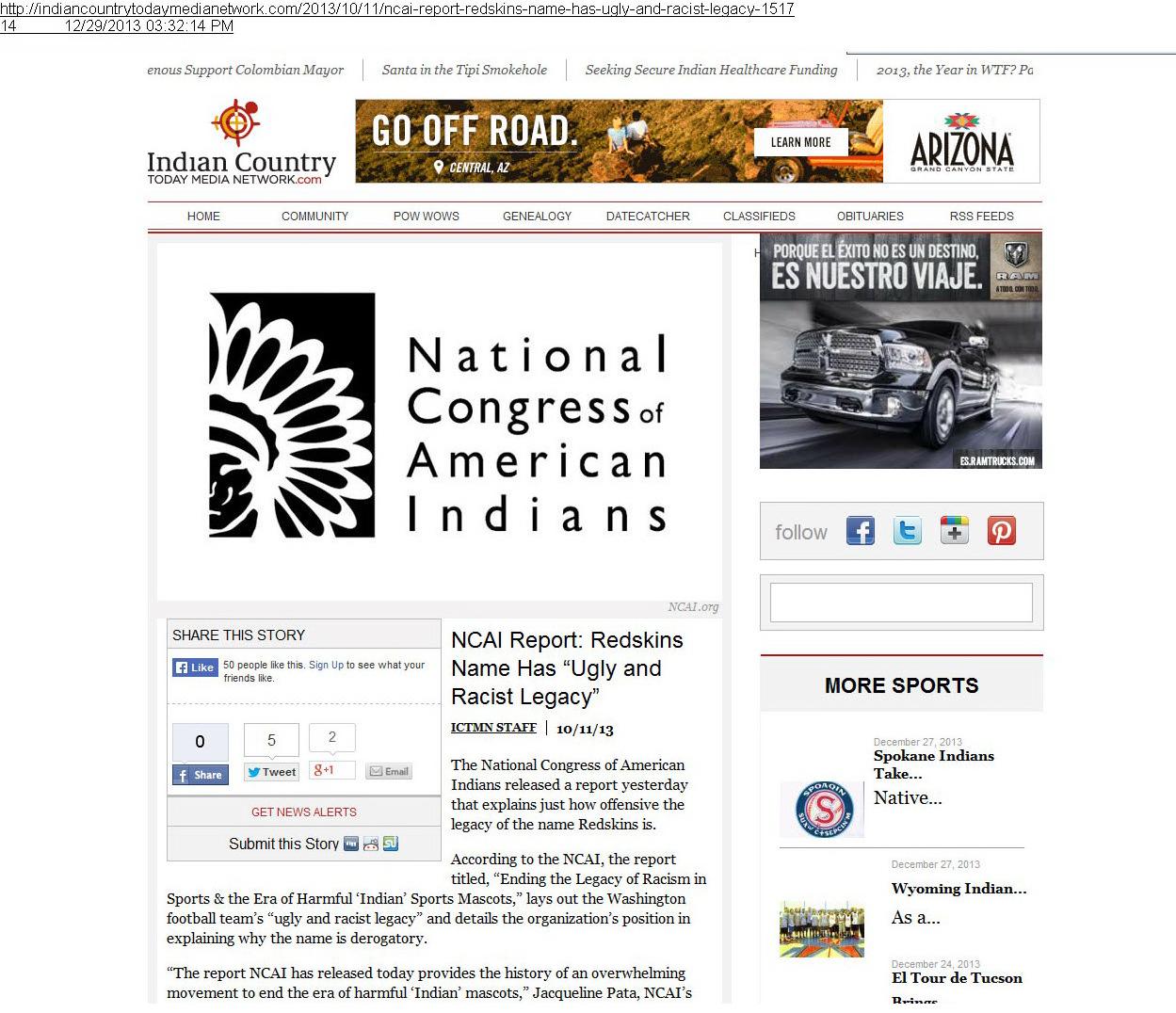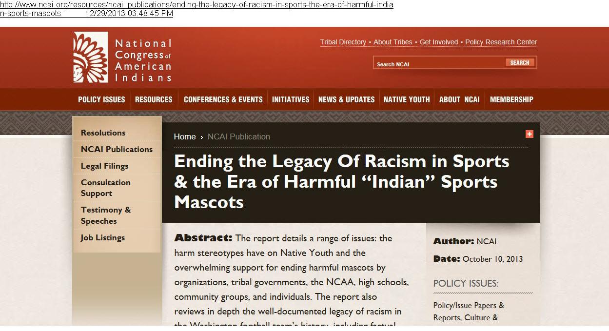As evidence that American Indians find the term “REDSKINS” offensive, see the attached news article, “NCAI Report: Redskins Name Has ‘Ugly and Racist Legacy’” (Indian Country Today online, October 11, 2013) located at http://indiancountrytodaymedianetwork.com/2013/10/11/ncai-report-redskins-name-has-ugly-and-racist-legacy-151714 (captured 12/29/13). In fact, the National Congress of American Indians (NCAI) now uses the designations “R*dskins” and “R Word” when referring to “REDSKINS” sports teams mascots (see, e.g., attachment from http://www.ncai.org/resources/ncai_publications/ending-the-legacy-of-racism-in-sports-the-era-of-harmful-indian-sports-mascots) captured 12/29/13.