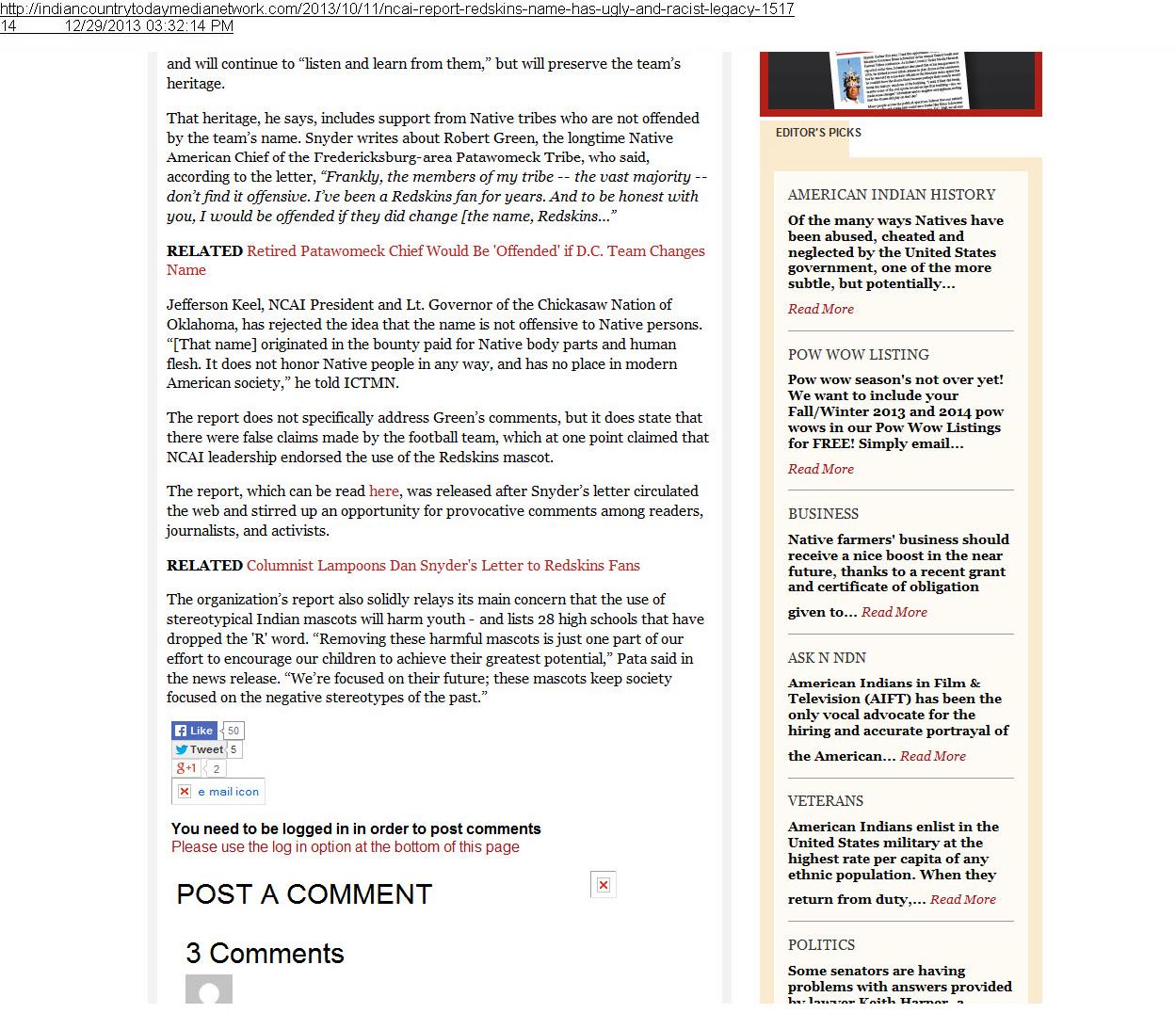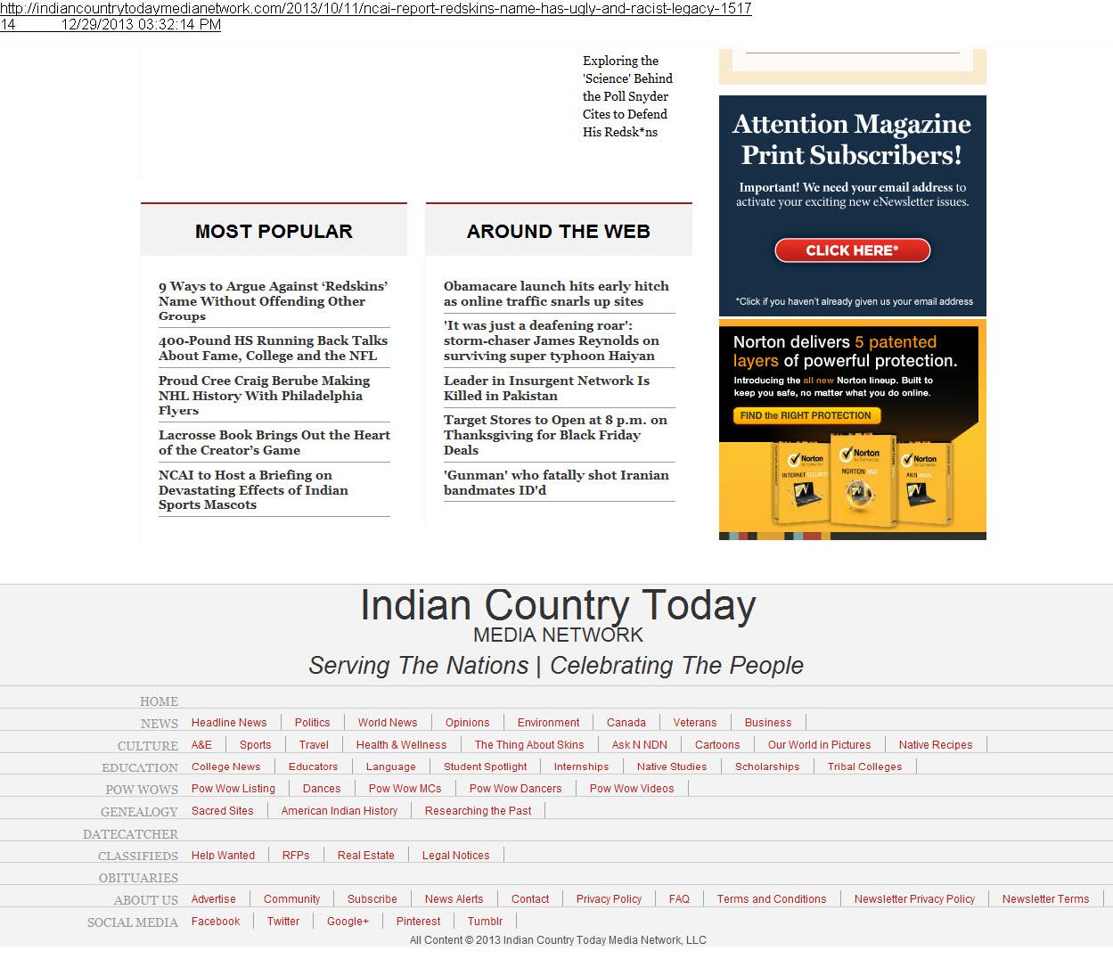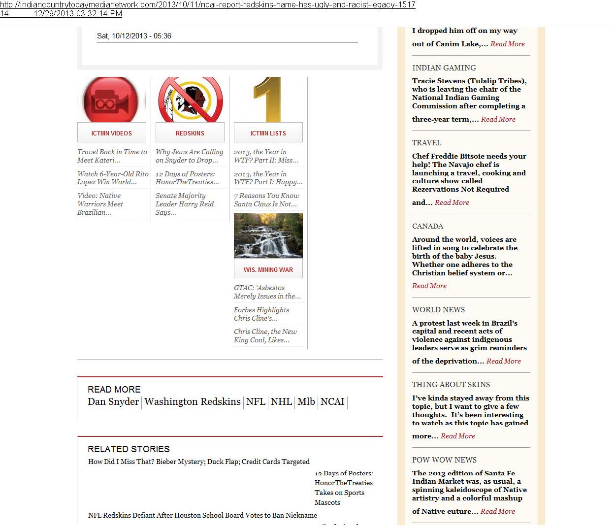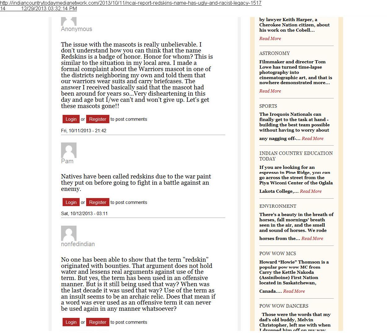 As evidence that American Indians find the term “REDSKINS” offensive, see the attached news article, “NCAI Report: Redskins Name Has ‘Ugly and Racist Legacy’” (Indian Country Today online, October 11, 2013) located at http://indiancountrytodaymedianetwork.com/2013/10/11/ncai-report-redskins-name-has-ugly-and-racist-legacy-151714 (captured 12/29/13). In fact, the National Congress of American Indians (NCAI) now uses the designations “R*dskins” and “R Word” when referring to “REDSKINS” sports teams mascots (see, e.g., attachment from http://www.ncai.org/resources/ncai_publications/ending-the-legacy-of-racism-in-sports-the-era-of-harmful-indian-sports-mascots) captured 12/29/13.