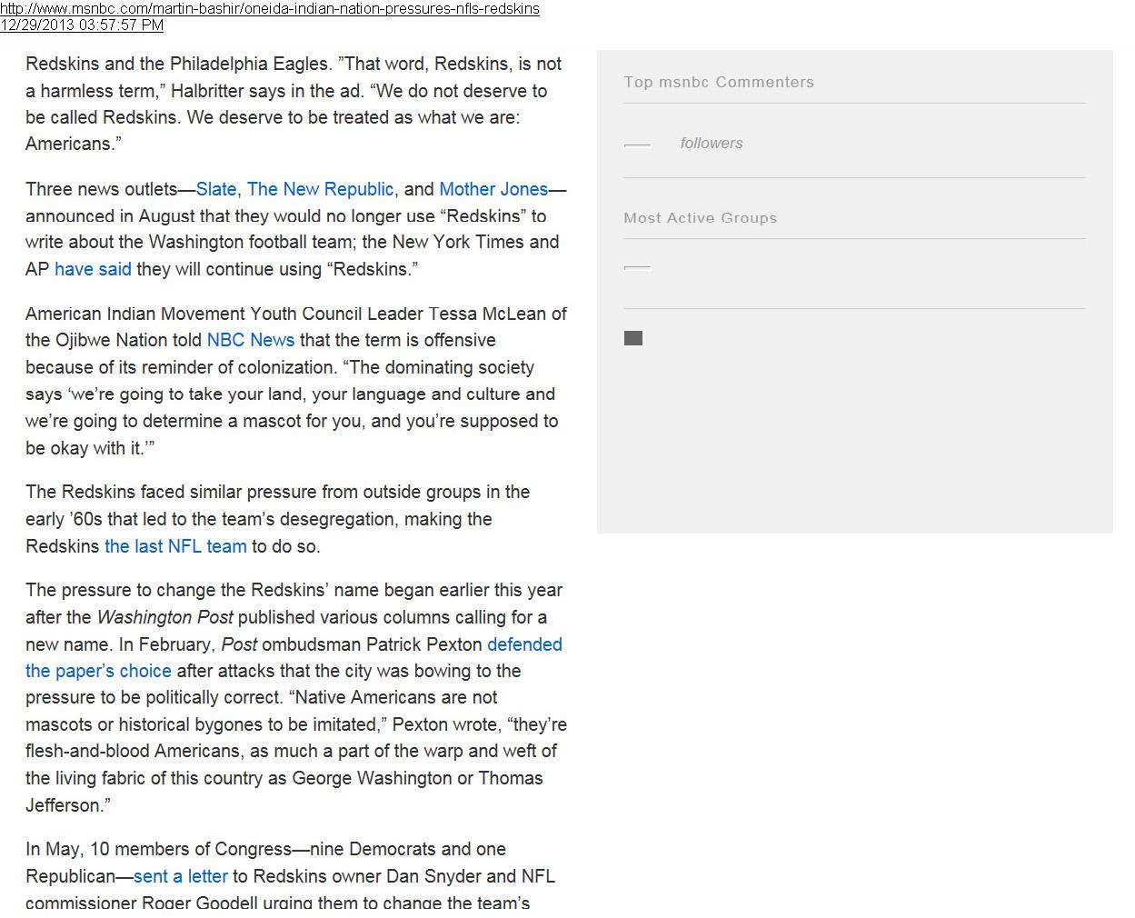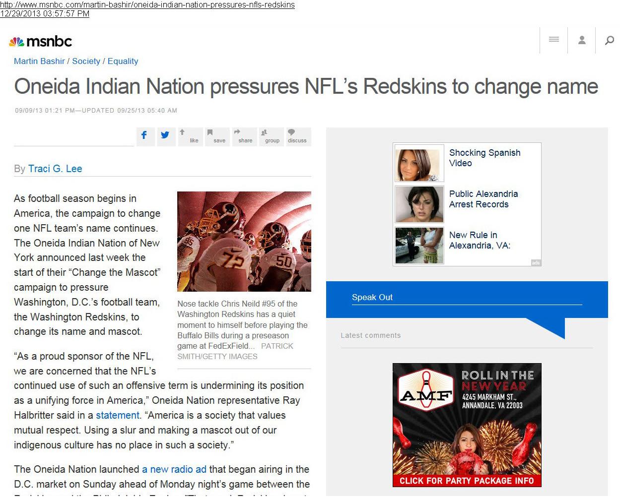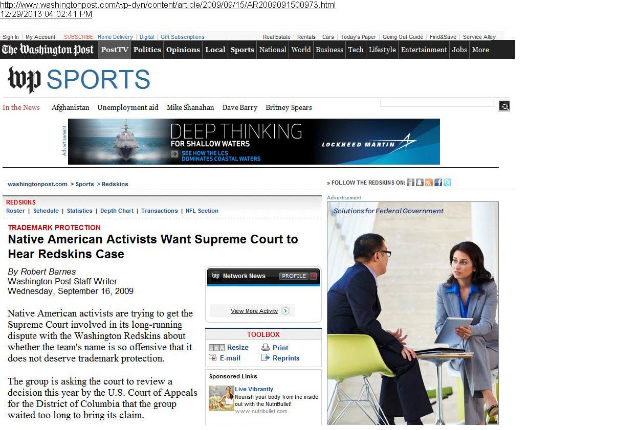 As additional evidence that American Indians find the term “REDSKINS” offensive, see the attached article, “Oneida Indian Nation pressures NFL’s Redskins to change name” (MSNBC, September 9, 2013)) located at http://www.msnbc.com/martin-bashir/oneida-indian-nation-pressures-nfls-redskins (captured 12/29/13). See also the attached article, “Native American Activists Want Supreme Court to Hear Redskins Case” (Washington Post, September 16, 2009) located at http://www.washingtonpost.com/wp-dyn/content/article/2009/09/15/AR2009091500973.html (captured 12/29/13), which states that “Native American activists are trying to get the Supreme Court involved in its long-running dispute with the Washington Redskins about whether the team’s name is so offensive that it does not deserve trademark protection.”