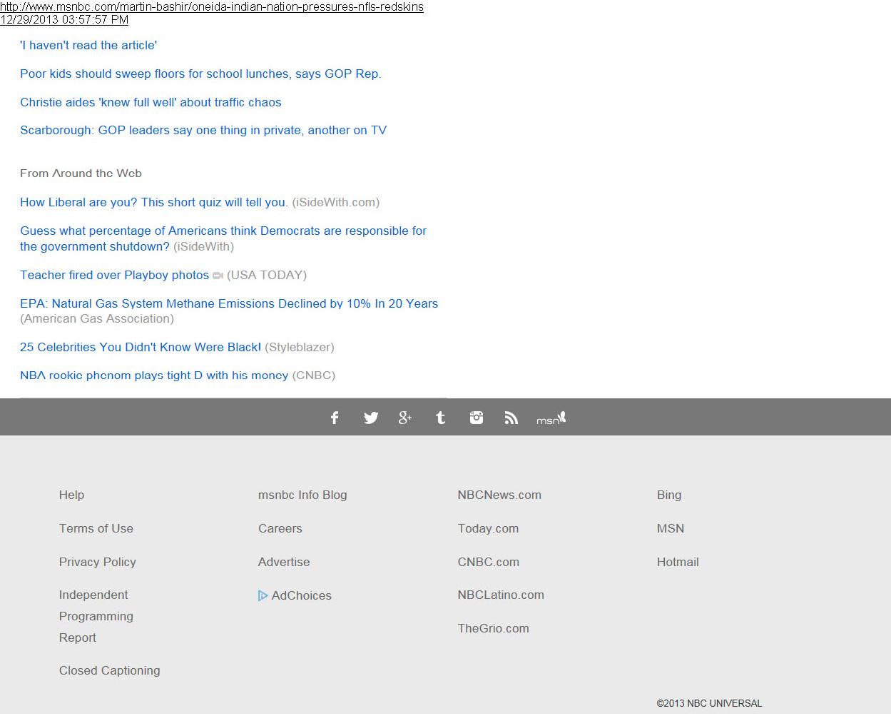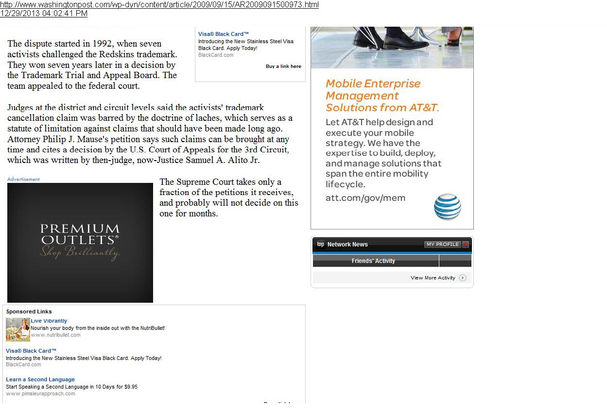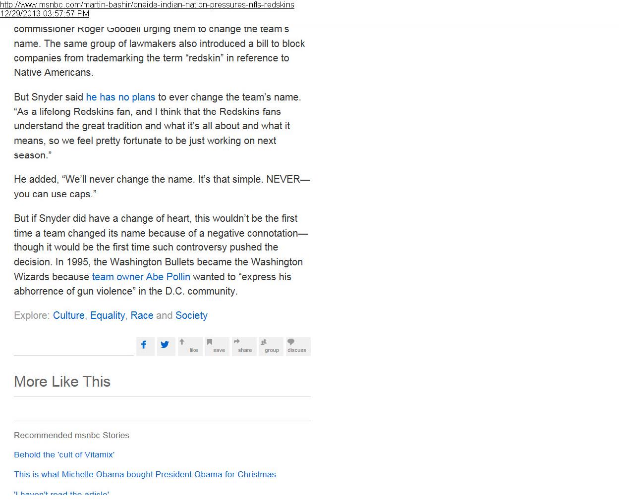 As additional evidence that American Indians find the term “REDSKINS” offensive, see the attached article, “Oneida Indian Nation pressures NFL’s Redskins to change name” (MSNBC, September 9, 2013)) located at http://www.msnbc.com/martin-bashir/oneida-indian-nation-pressures-nfls-redskins (captured 12/29/13). See also the attached article, “Native American Activists Want Supreme Court to Hear Redskins Case” (Washington Post, September 16, 2009) located at http://www.washingtonpost.com/wp-dyn/content/article/2009/09/15/AR2009091500973.html (captured 12/29/13), which states that “Native American activists are trying to get the Supreme Court involved in its long-running dispute with the Washington Redskins about whether the team’s name is so offensive that it does not deserve trademark protection.”