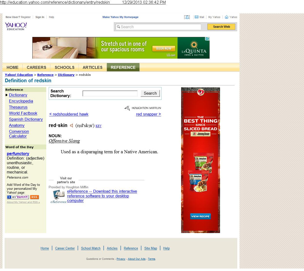 “Offensive Slang Used as a disparaging term for a Native American” (see attached evidence from http://education.yahoo.com/reference/dictionary/entry/redskin captured 12/29/13);