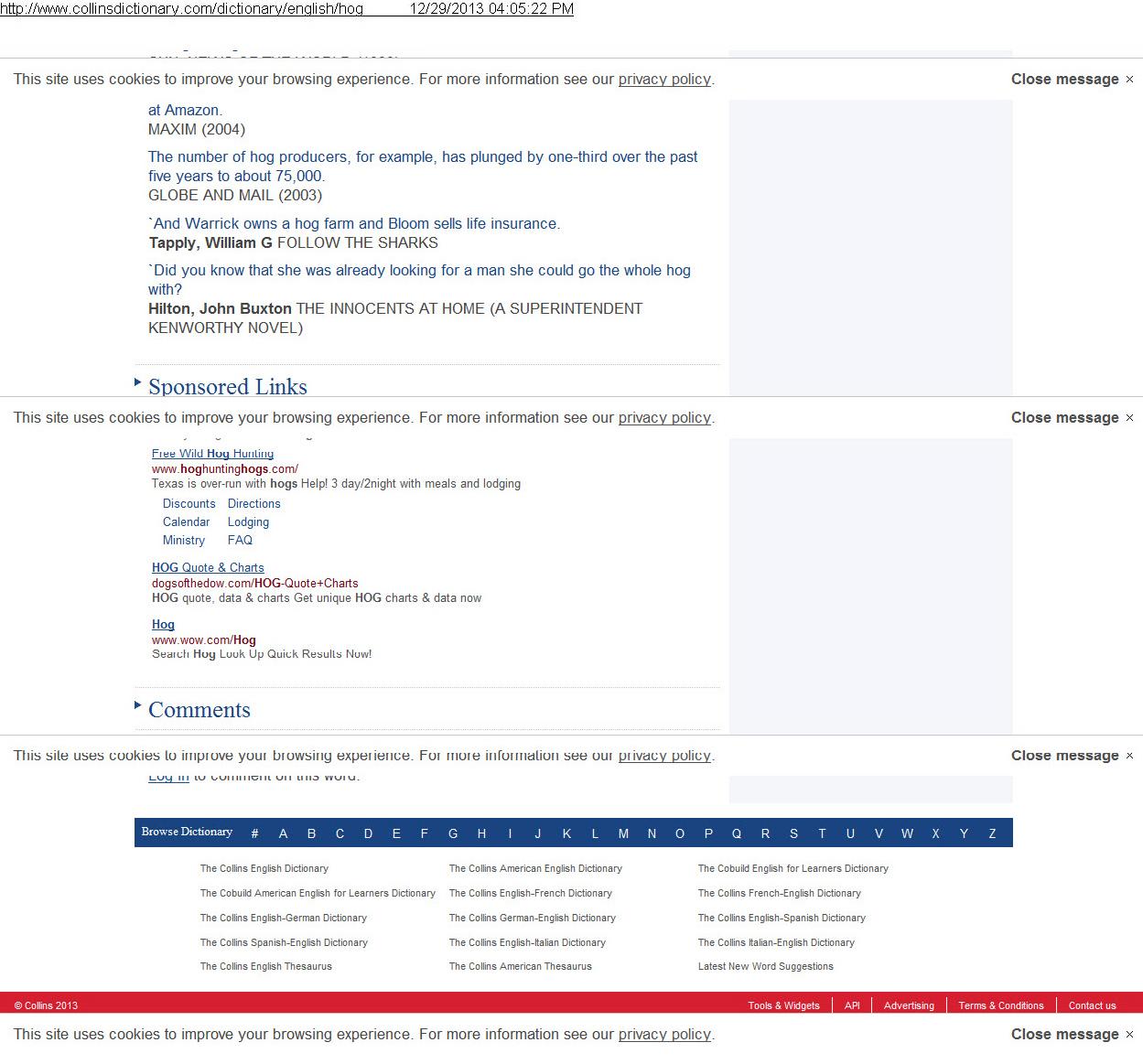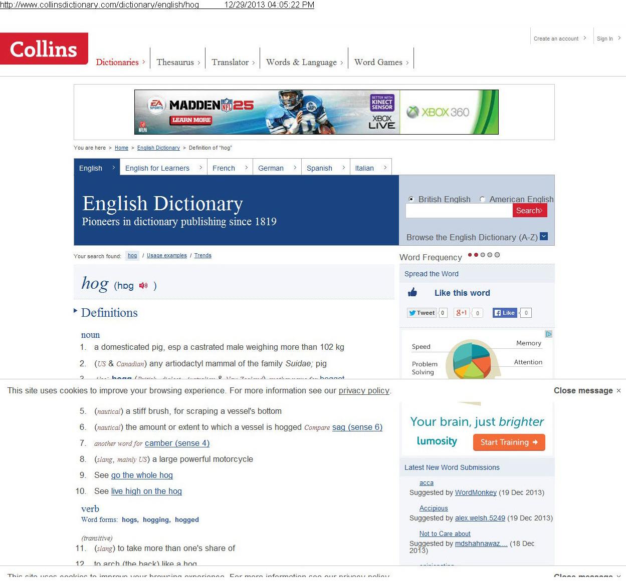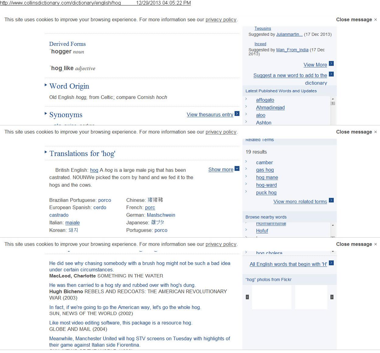 “HOG” means “a domesticated pig” (see attached evidence from http://www.collinsdictionary.com/dictionary/english/hog captured 12/29/13). Applicant’s goods are pork RINDS; therefore, the wording “HOG RINDS” merely describes the nature of the goods.