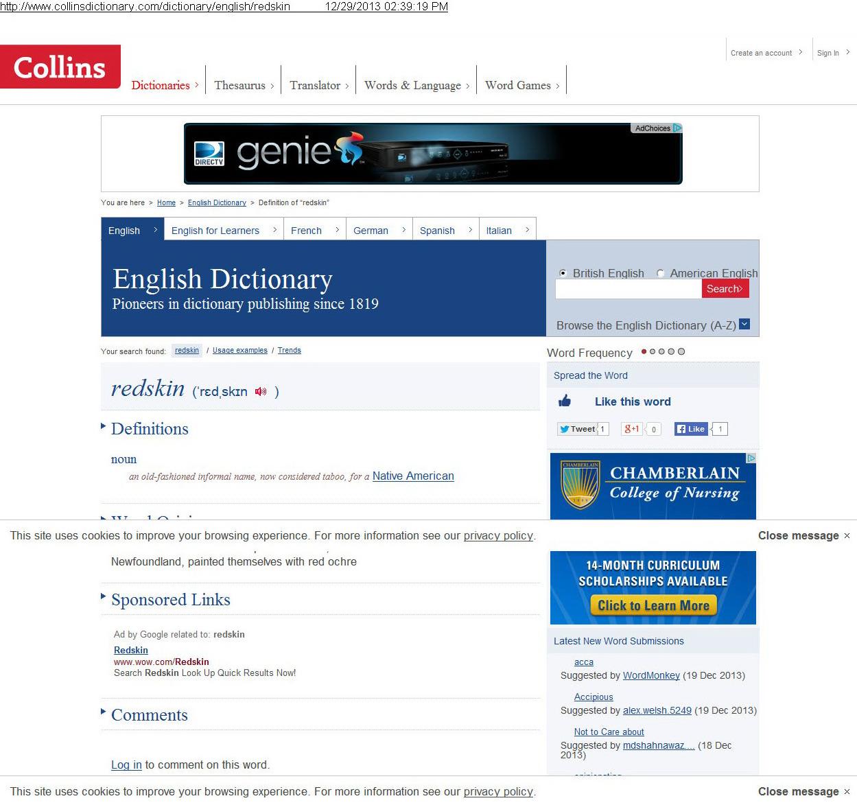 “an old-fashioned informal name, now considered taboo, for a Native American” (see attached evidence from http://www.collinsdictionary.com/dictionary/english/redskin captured 12/29/13);