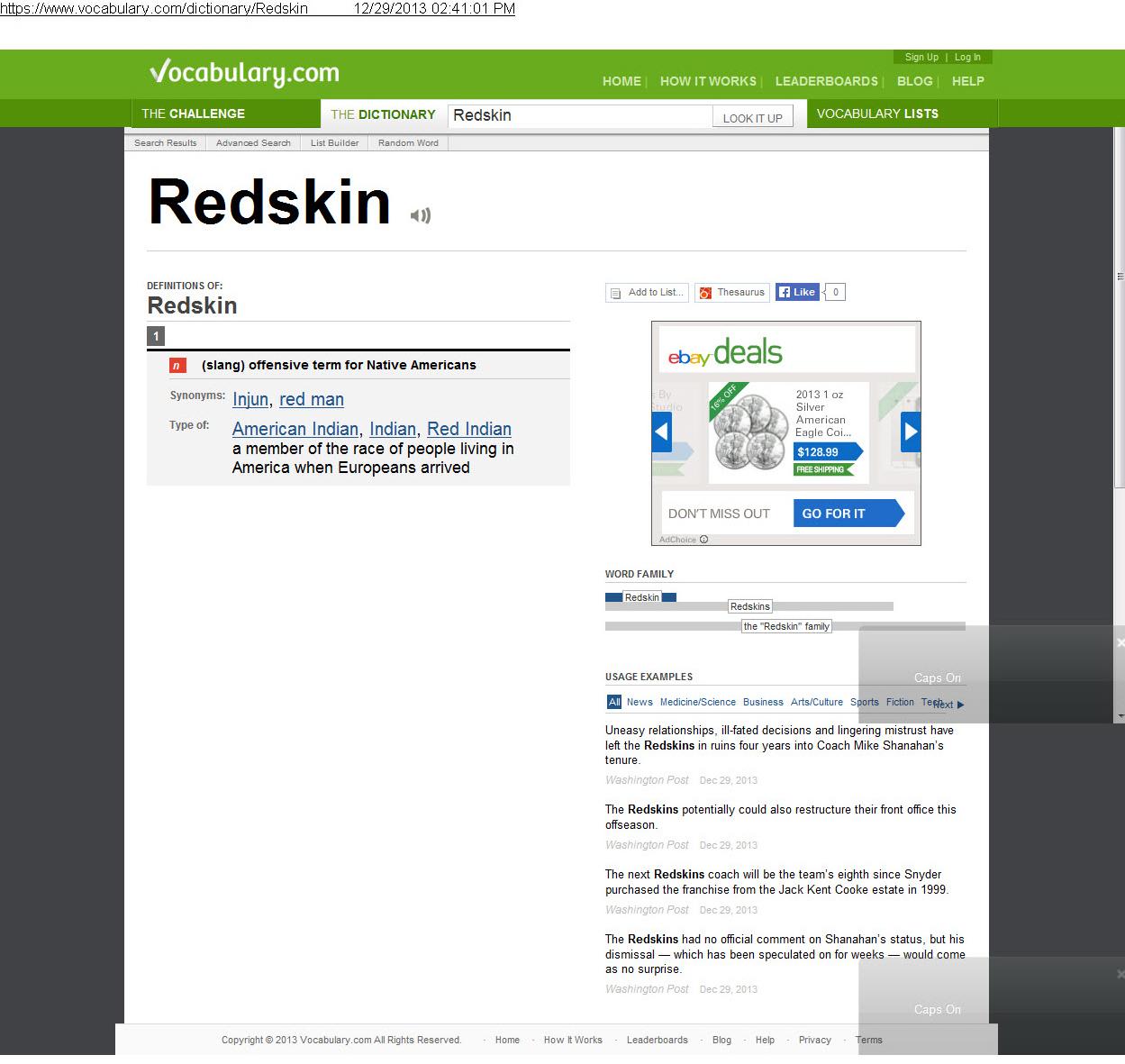 “(slang) offensive term for Native Americans” (see attached evidence from https://www.vocabulary.com/dictionary/Redskin captured 12/29/13);