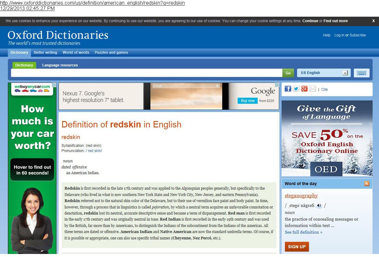 “dated offensive an American Indian” (see attached evidence from http://www.oxforddictionaries.com/us/definition/american_english/redskin?q=redskin captured 12/29/13);