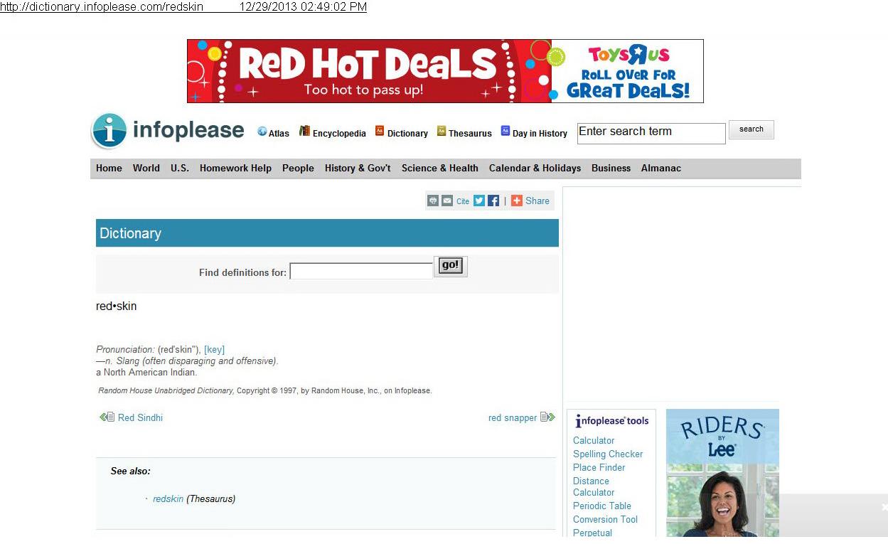 “Slang (often disparaging and offensive) a North American Indian” (see attached evidence from http://dictionary.infoplease.com/redskin captured 12/29/13).
