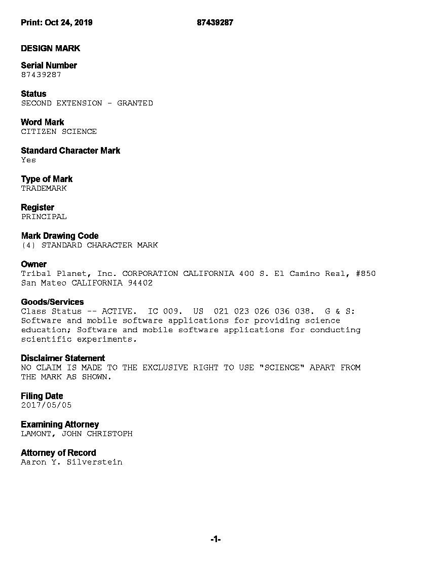 | U.S. Application Serial No. 88550393 Mark: THE CITIZEN SCIENCE LAB | |